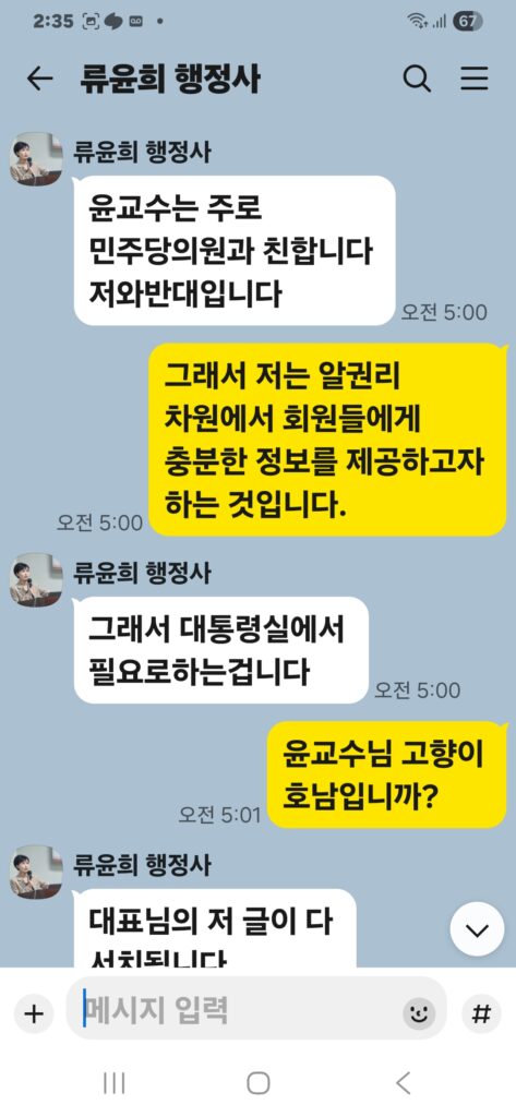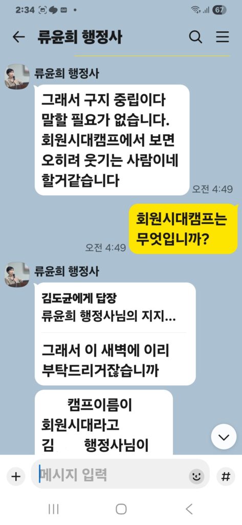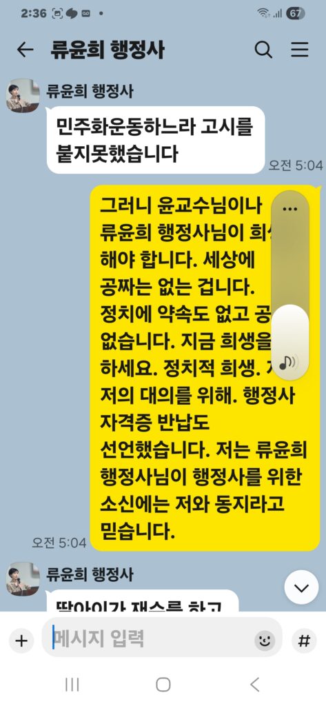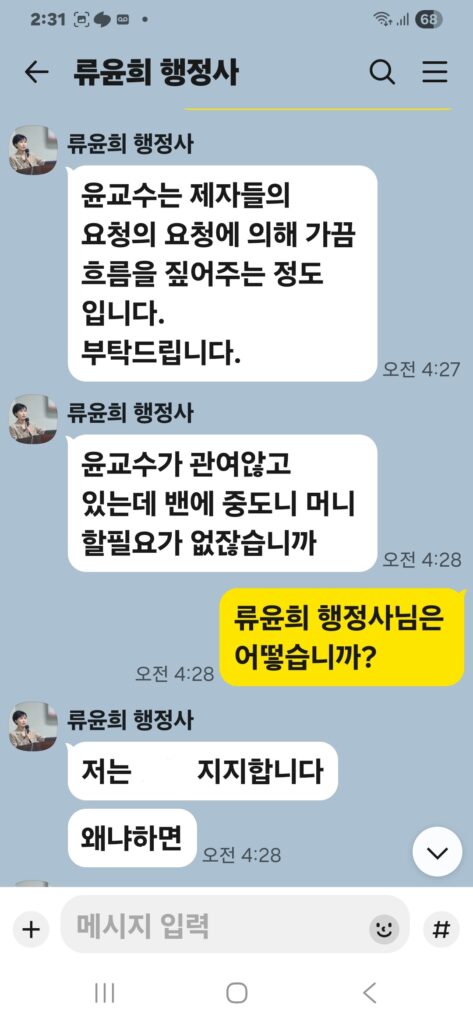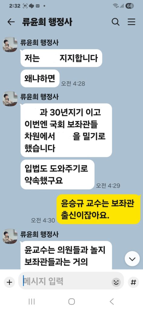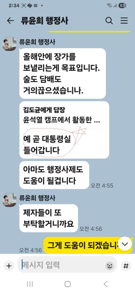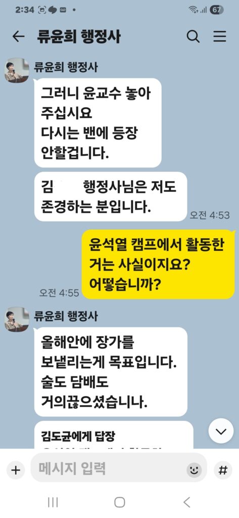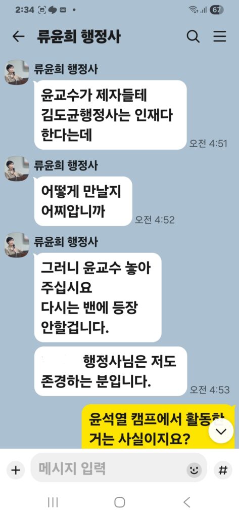 윤승규 배우자 류윤희는 윤승규의 친위쿠데타 본진 용산 대통령실 진입을 위해 눈물겨운 구걸 행각을 카톡 대화방에서 김도균에게 벌였다.