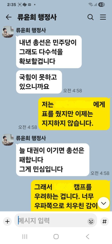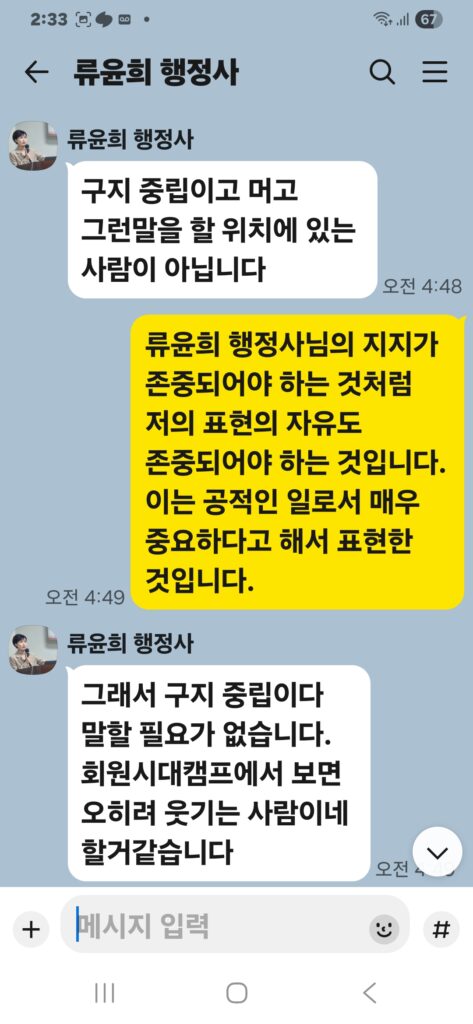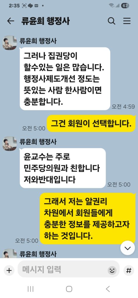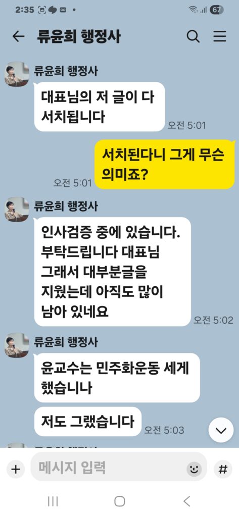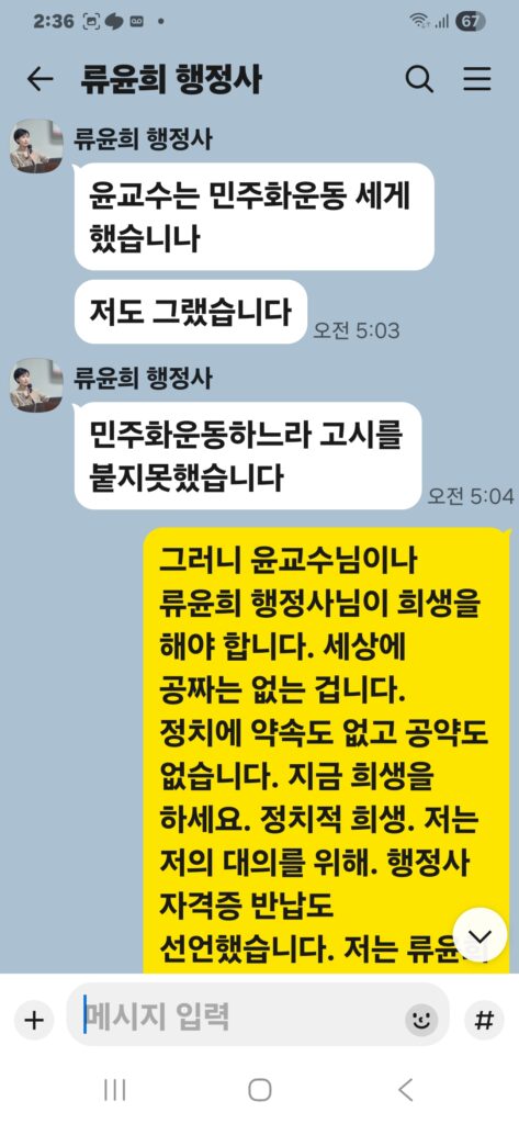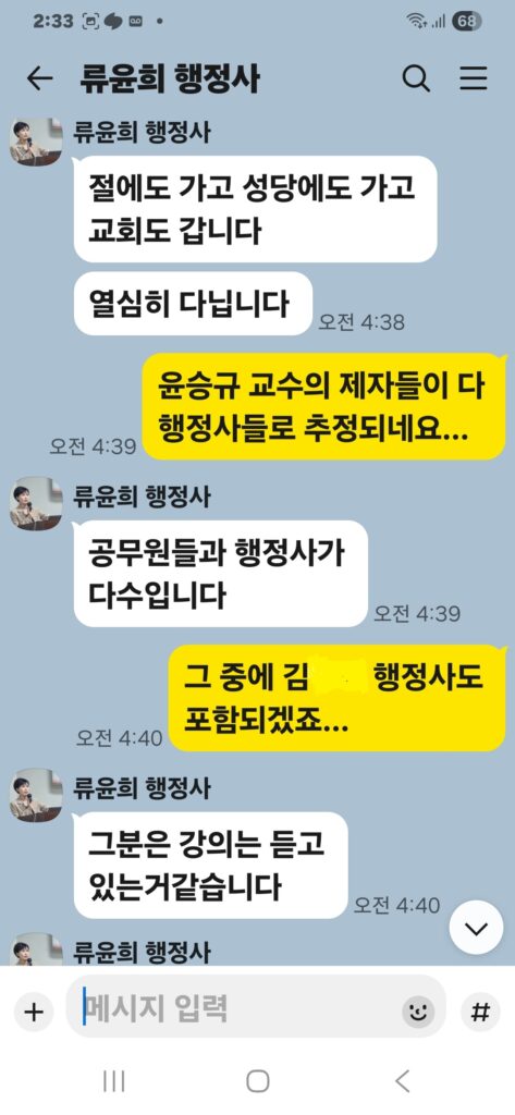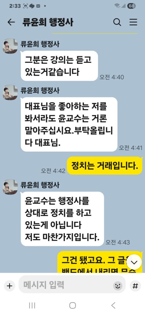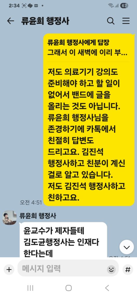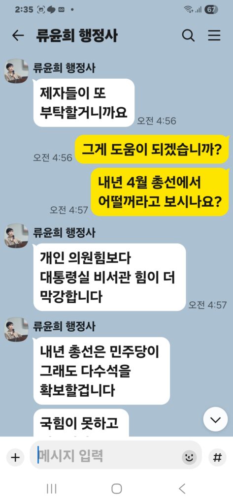 윤승규 배우자 류윤희는 윤승규의 친위쿠데타 본진 용산 대통령실 진입을 위해 눈물겨운 구걸 행각을 카톡 대화방에서 김도균에게 벌였다.