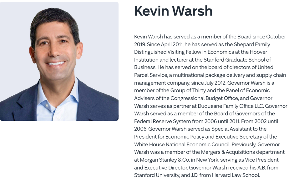 워시 지명자는 1970년생으로 스탠퍼드대와 하버드 로스쿨을 거쳐 모건스탠리, 백악관 경제 특별보좌관을 지낸 화려한 이력을 보유하고 있다.