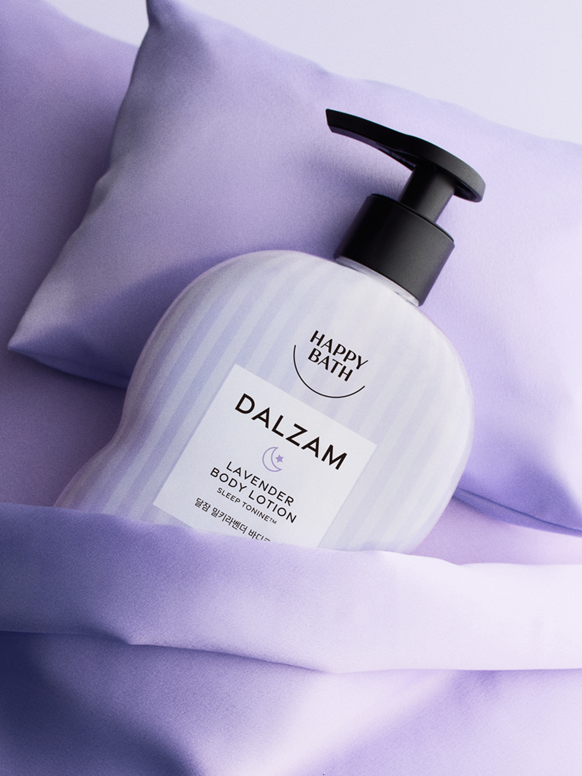해피바스 달잠 라인은 포근한 이불 속에 파묻힌 듯한 밀키 라벤더 향을 기반으로 한다.